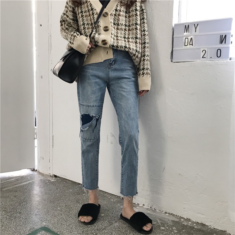 | (สินค้าพร้อมส่ง)กางเกงยีนส์ทรงบอยขาเดฟขาดข้าง |