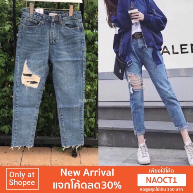 กางเกงยีนส์ เอวสูงแต่ง ขาด