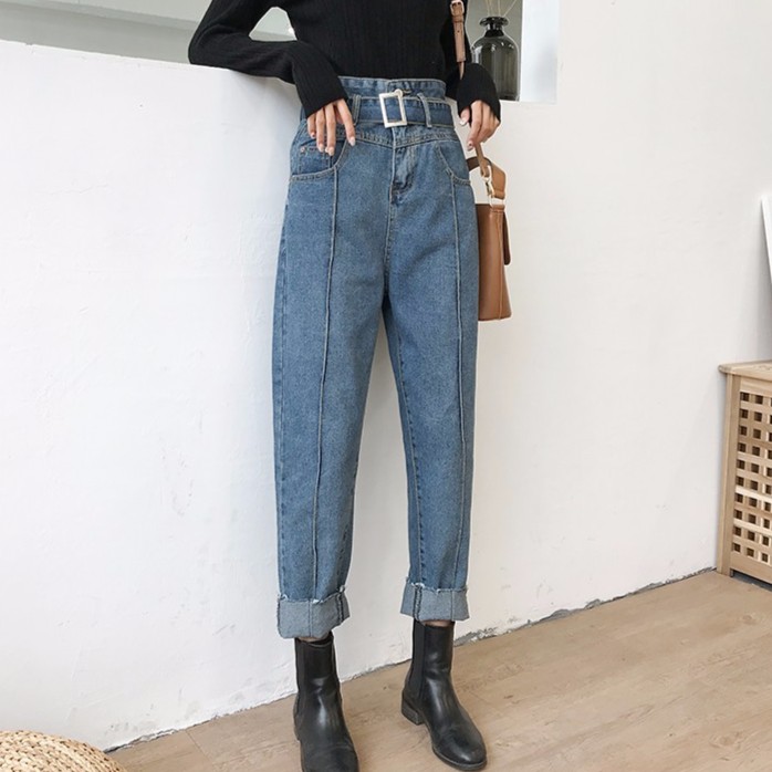 สไตล์ย้อนยุคเข็มขัดเส้นสูบน้ำแรงดันการออกแบบต้องขรุขระขอบฉีกฝอยกางเกงยีนส์หญิง เอวผอมกางเ EASON-SHOPGU6938ฮ่องกงจริงนัด