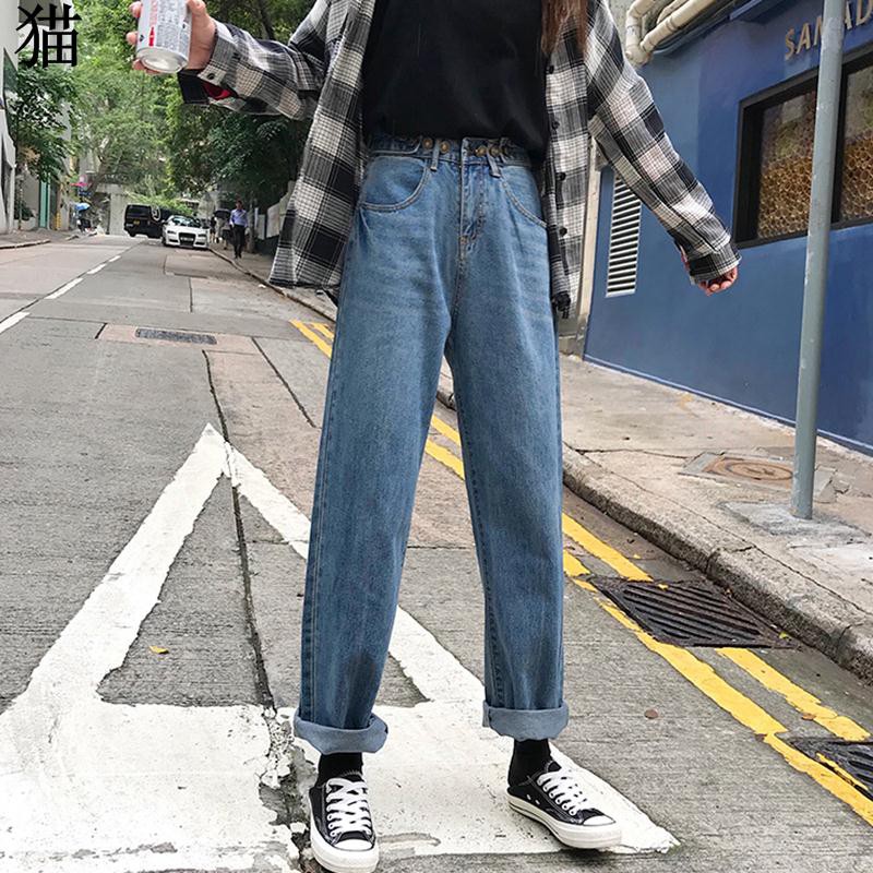 ฤดูใบไม้ร่วงใหม่ของเกาหลีย้อนยุคหลวมย้อนยุคบางสูง เอวตรงกางเกงยีนส์ยาวกา 2018