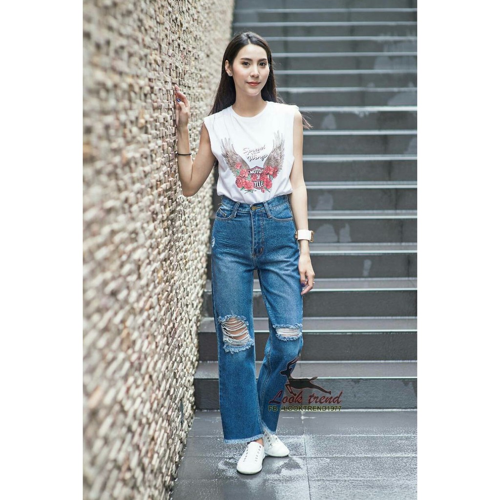 | กางเกงยีนส์ขากระบอกแต่งขาด เซอๆ |