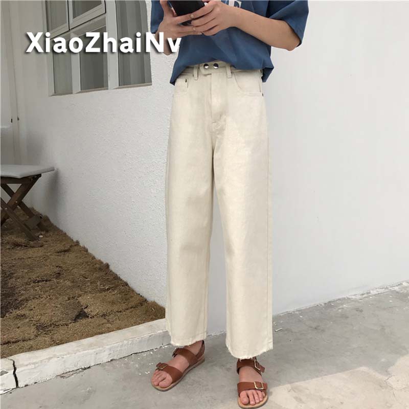 กางเกงยีนส์ สไตล์เกาหลี กางเกงยีนส์ เอวสูงทรงตรงสีเบจ กางเกงยีนส์แฟชั่น