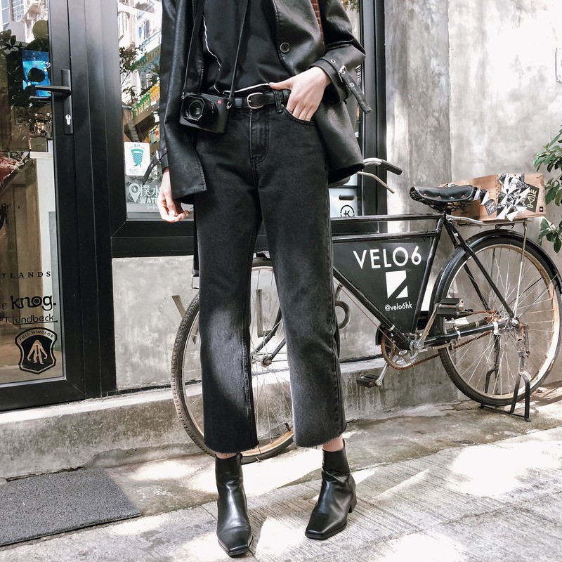 JHXC ย้อนยุคควันสีเทากางเกงยีนส์ ขากว้างผู้หญิง เอวสูงฤดูใบไม้