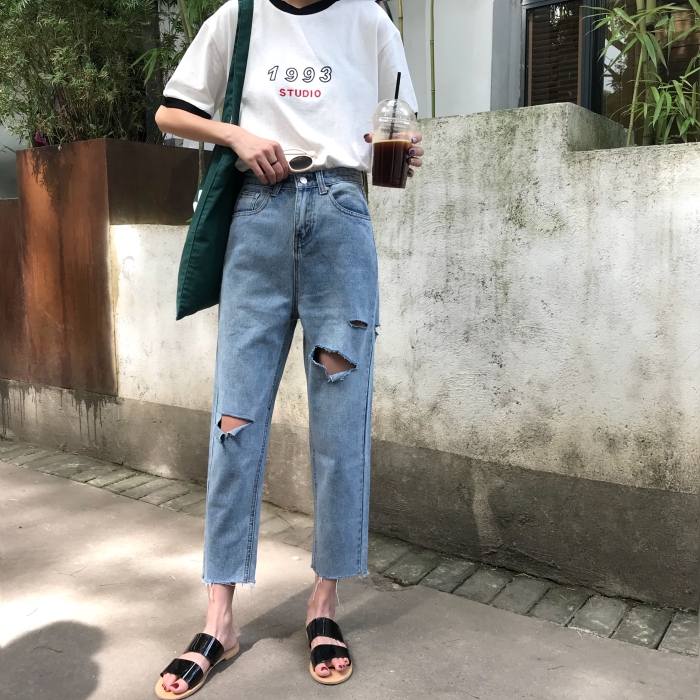 2018 กางเกงยีนส์ เอวสูง สไตล์เกาหลีสำหรับผู้หญิง
