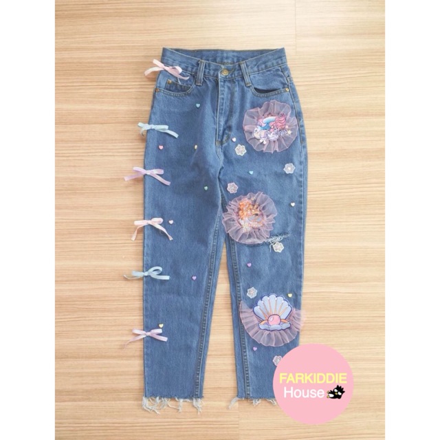 กางเกงยีนส์แต่งโบว์ ปักนางเงือกหอยเชลล์