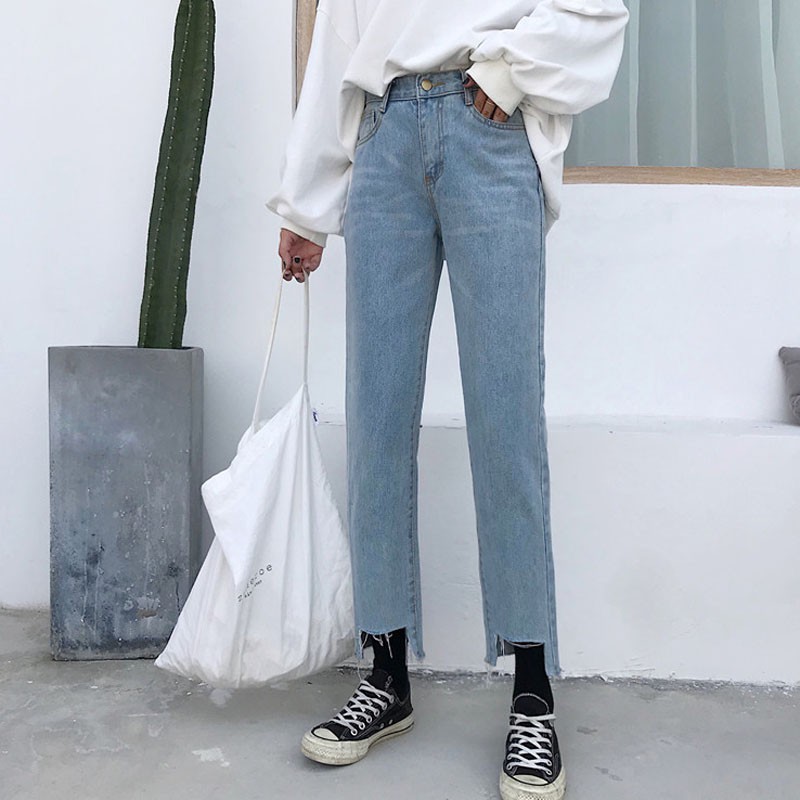 กางเกงยีนส์ทรงหลวม เอวสูง สไตล์เกาหลีสำหรับผู้หญิง นำเข้า ชุด ถูก