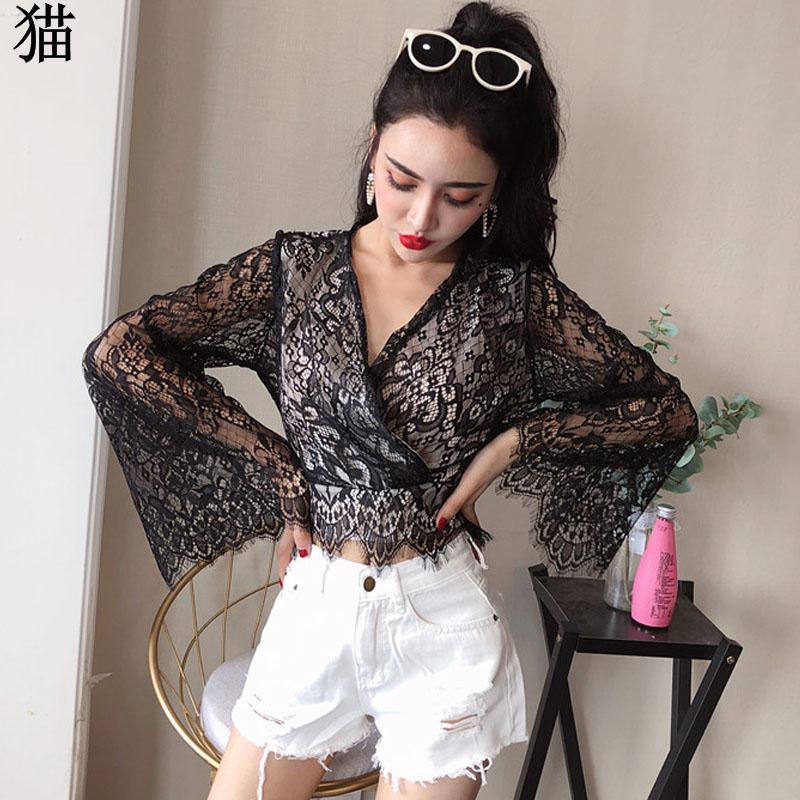 ฤดูใบไม้ร่วงใหม่แฟชั่นเซ็กซี่ข้าม V คอ flares-lashes เสื้อลูกไม้กางเกงยีนส์บาง S