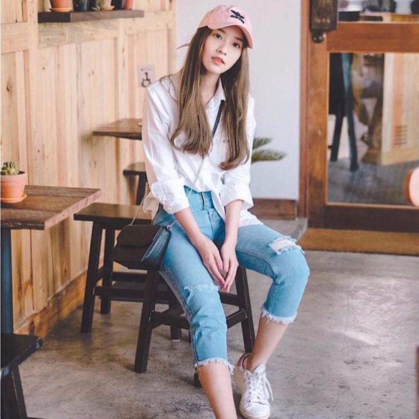 | สียีนส์ซีด ส่วน 5 /กีด Boyfriend/ ผ้านอกทรงบอลลูน ขาด กางเกงยีนส์ เอวสูง Artery-Jeans |