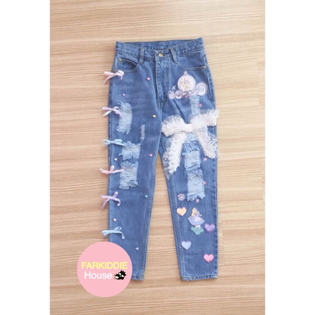 กางเกงยีนส์แต่งโบว์ ปักน้องอลิส