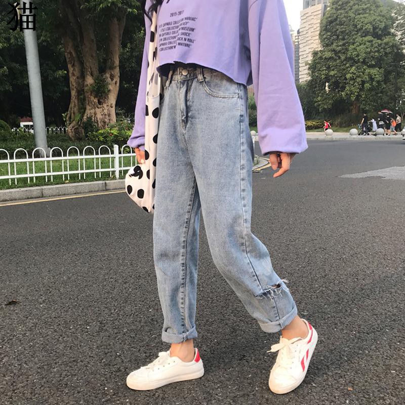 2018 ฤดูใบไม้ร่วงใหม่ของเกาหลี เอวสูงเก๋ไก๋หลวม เป็นนักเรียนป่าบางตรงกางเกงยีน