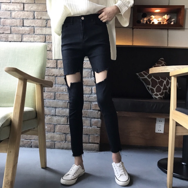 กางเกงยีนส์ดำ ทรง ขาด งานเกาหลี