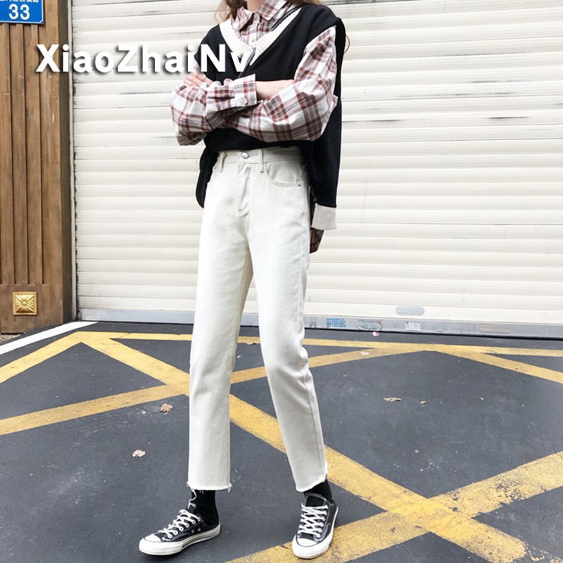 | กางเกงยีนส์เอวสูงทรงตรงสีเบจ กางเกงยีนส์แฟชั่น สไตล์เกาหลี ♥กางเกงยีนส์ |