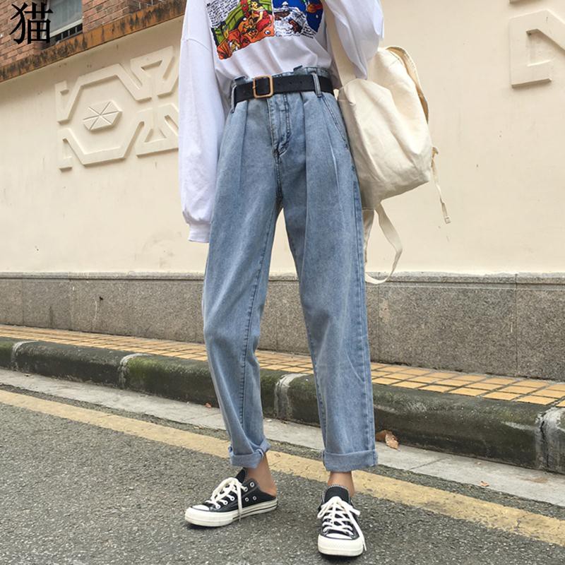 ฤดูใบไม้ร่วง ใหม่ของเกาหลีเก๋ไก๋ย้อนยุค เอวสูงบางหลวมกางเกงยีนส์ตรงยาวกา 2018