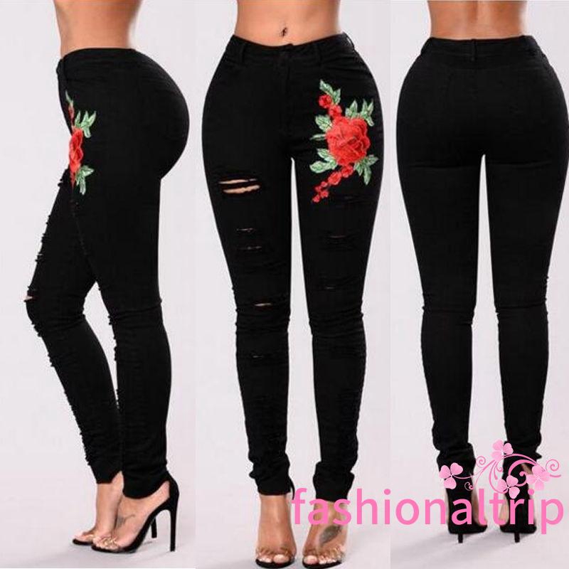 กางเกงยีนส์แบบเย็บ ปักลายดอกไม้สำหรับผู้หญิง