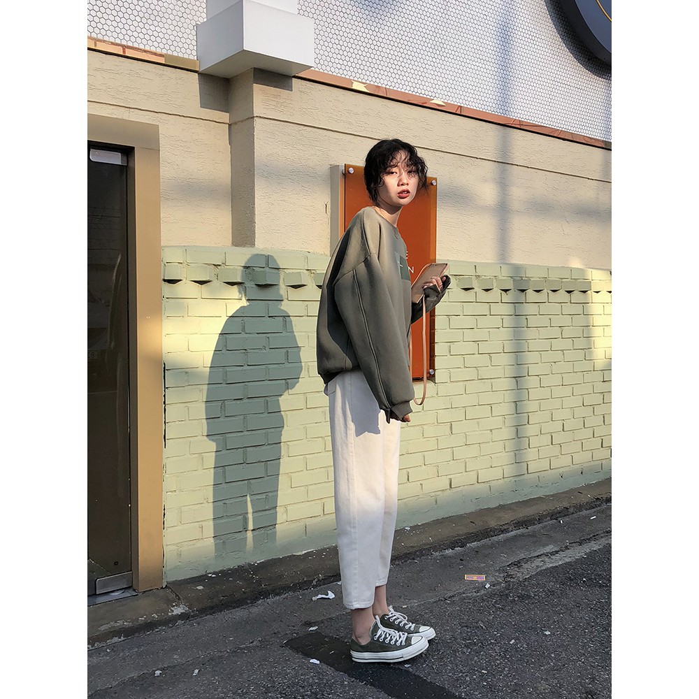 | ผ้าดีมากใส่สบายสไตล์วินเทจหลุ่ยปลาย เวอร์ชั่นเกาหลีของแฟชั่นร้อนหลวมเอวสูงใหม่สีทึบตรง กางเกงยีนส์ 👌 |