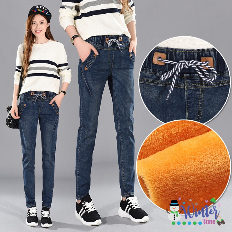 | กางเกงยีนส์กันหนาวบุขน ราคาถูก ไซส์ใหญ่ ขายส่ง เอวยางยืดผูกเชือก |