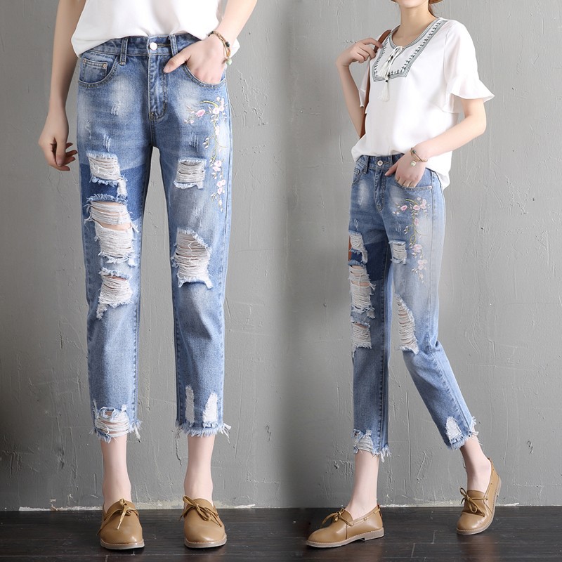 2018 กางเกงยีนส์ ขายาวสำหรับสตรี ผ้าชาย ขาด