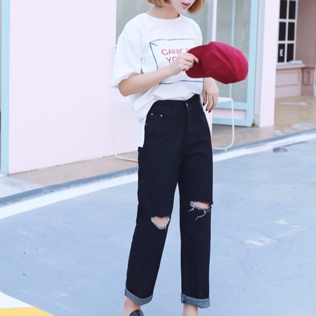 Actually-shoot the-Harajuku black-obviously thin-hole high-waist bf-wind autumn