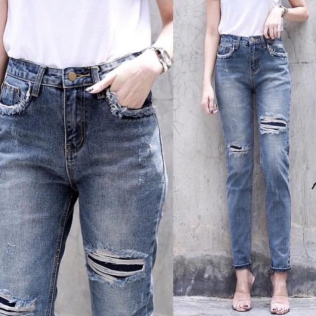 กางเกงยีนส์ทรงบอย สไตล์เกาหลี ขาด มีซับปะ ด้านใน ราคาถูก เดรส ชุดเดรสยาว