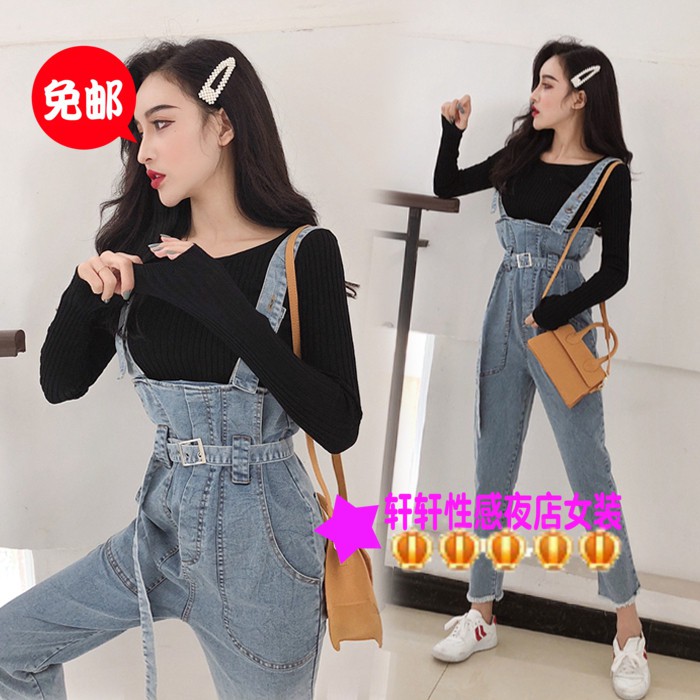 ฤดูใบไม้ร่วงนิสัยใหม่ถนนสตรีท สไตล์ฮ่องกง สาวสบายๆ กางเกงยีนส์ ผ้ากันเปื้อนแฟชั่นสองชิ้นชุดของผู้หญิงน้ำ 2018 |