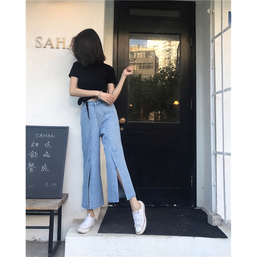 | กางเกงยีนส์ สไตล์เกาหลี Happy-girl โคกแบ่งหลวมนันทนาการเปิดใหม่ สตรี JAL ขาเก้า ขายาว เอวสูง |