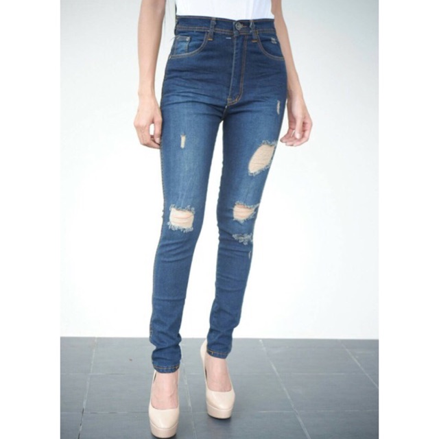 | ขายส่ง New-Punny เอวสูงสีน้ำเงินฟอกยับแต่ง ขาดฟู แซก สินค้าขายดี กางเกงยีนส์ |